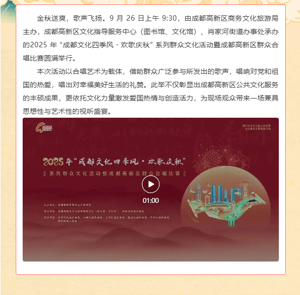 歌声颂秋韵 文化润人心——2025年 “成都文化四季风・欢歌庆秋”系列群众文化活动暨高新区群众合唱比赛圆满举行