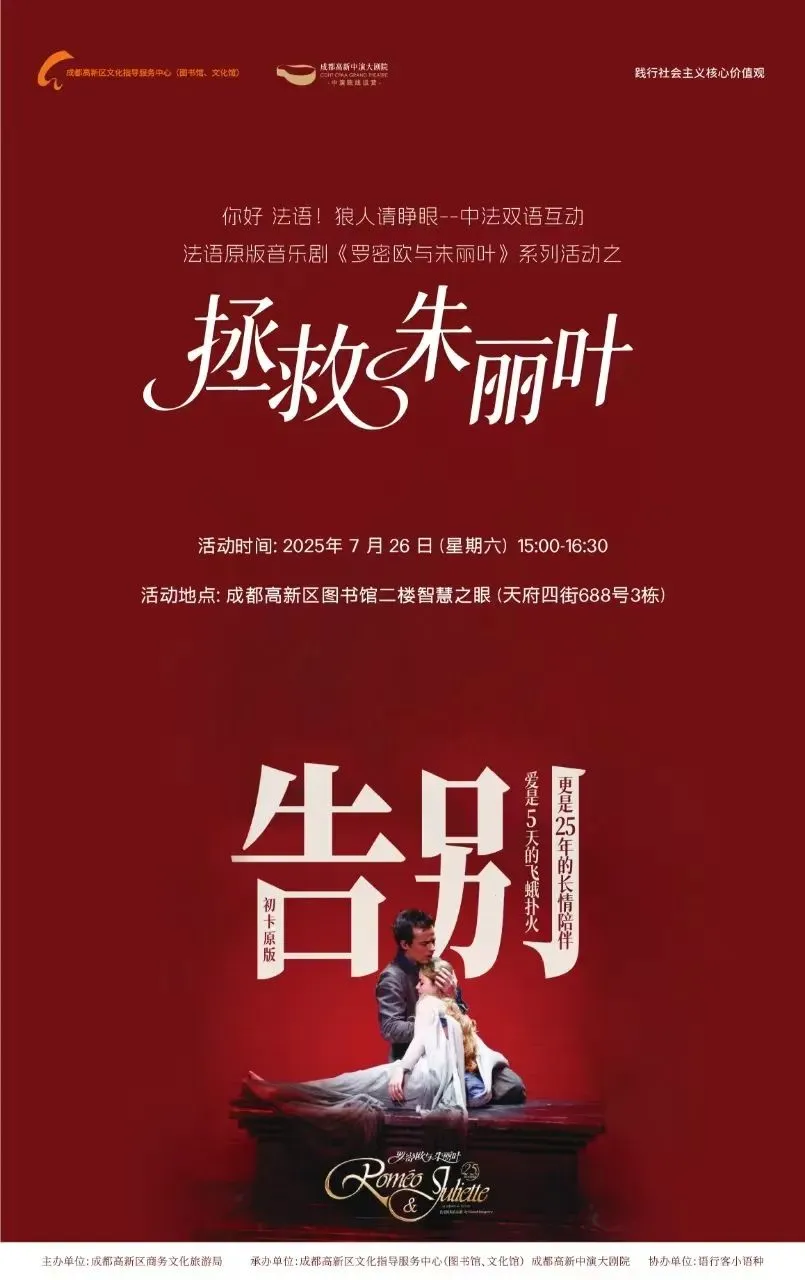 加入“狼人请睁眼——拯救朱丽叶”中法双语互动现场,你将化身《罗密欧与朱丽叶》世界的一员!从趣味法语入门到实用口语速成,再到紧张刺激的双轮“狼人杀”实战——先热身熟悉规则,再投身终极“拯救朱丽叶”之战!全程参与感爆棚。在沉浸式角色扮演与策略博弈中,轻松解锁法语魅力,感受法国文化心跳,等你来挑战语言与智力的双重游戏!