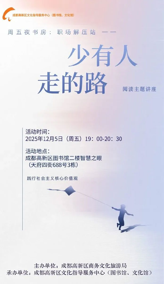 无论你现在处于人生的哪个阶段,《少有人走的路》这本书都能给你带来新的视角和力量,帮助你更好地理解自己,也理解周围的世界。它带给你的不只是知识,更是重新审视生活的勇气,在字里行间找到属于自己的答案,在阅读中遇见更好的自己。本周五晚,让我们相约图书馆,用一本书的时间,找到另一个自己。