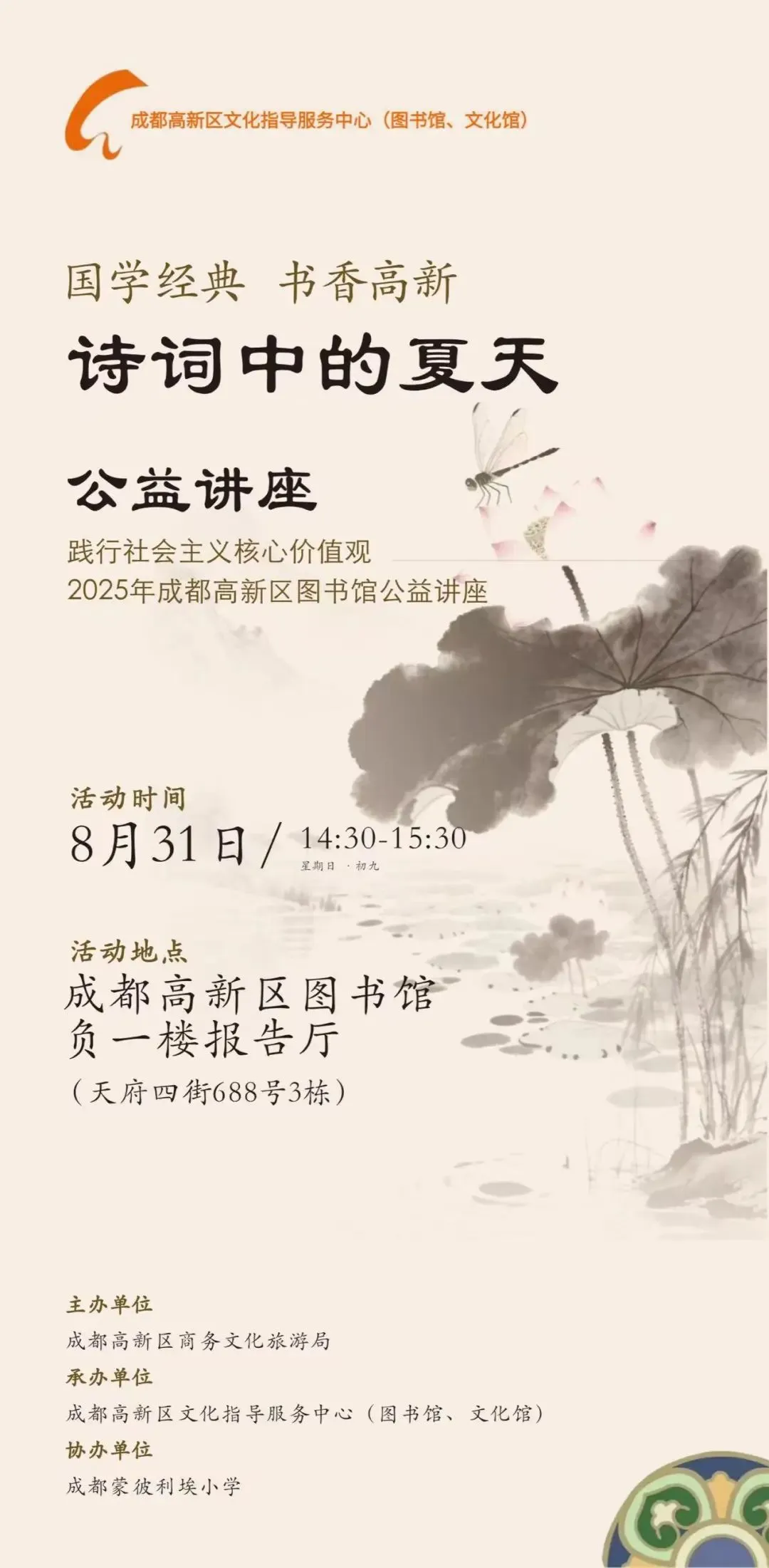 人皆苦酷热,我爱夏日长——伤春悲秋无果,那不如跟随诗词的脚步,走进这个四季中最有活力的季节,去探寻莲叶荷花,去品味绿荫黄鹂,去重温慵懒午睡,去欣赏鹭影蛙鸣……夏日炎炎,情思缱绻,这个八月的尾巴,盛情邀请你走进高新区图书馆,聆听《诗词中的夏天》。