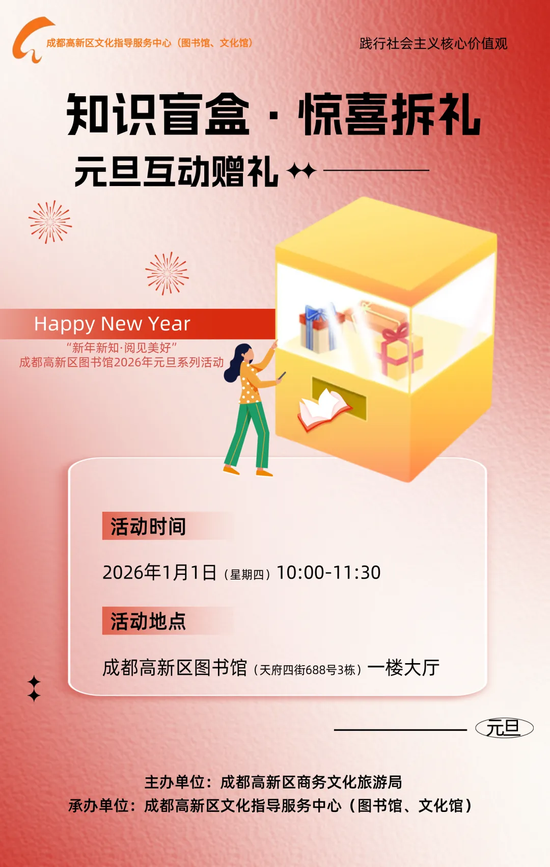 新年第一天,来成都高新区图书馆亲手拆一份特别的“知识盲盒”吧。每一份都是未知的礼物,每一刻都充满打开的喜悦。元旦节当天,我们在图书馆不见不散,一起收获2026年的第一份小幸运!