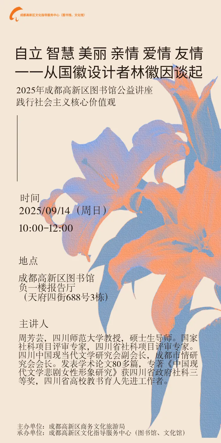 我们特邀四川师范大学周芳芸教授,带你穿越时光,一起走近这位二十世纪中国极具风采的女性。讲座将从林徽因参与国徽与纪念碑设计的幕后故事切入,延伸至她与梁思成共同守护古建筑的壮阔历程,再现她如何以独立之精神、深澈之智慧,平衡事业、家庭、友谊与爱情。让我们共赴一场人文与美的精神之旅。