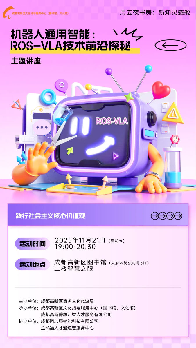 人工智能与机器人技术正深度融合,推动机器人从专用工具向通用智能体加速演进。如今的机器人已不再是只能执行重复指令的机械臂,而是逐渐成长为能感知环境、理解意图并自主行动的智能伙伴。本期周五夜书房将围绕机器人“端侧智能技术”展开,深入探讨VLA视觉语言动作模型的最新研发成果。活动邀请到成都高新区独角兽企业、人工智能领域的新兴力量成都阿加犀智能科技有限公司机器人事业部高级算法工程师、算法组组长康斌,带领各位科技爱好者共同探索机器人通用智能的奥秘。让我们在科技与智慧碰撞的舞台上,共同感知机器人智能新时代。