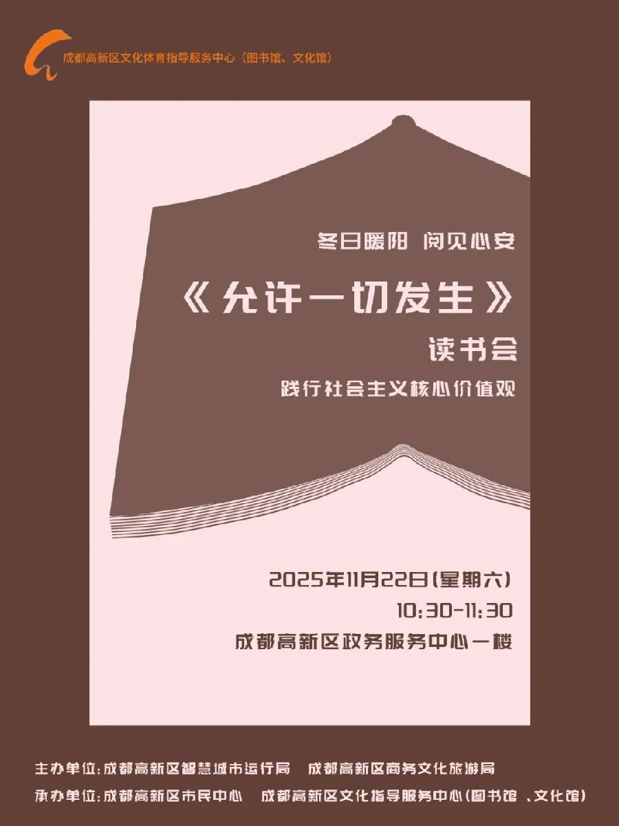 《允许一切发生》被称为“现代人的心灵成长指南”,本书通过作者在学业、事业、情感等人生课题上的真实故事,阐释“允许一切发生”的智慧——它不是消极妥协,而是接纳无常、包容情绪、释怀不完美。本期读书会活动,邀您共读此书,一同探索如何在纷繁复杂的生活中学会与自我和解、与现实和解。