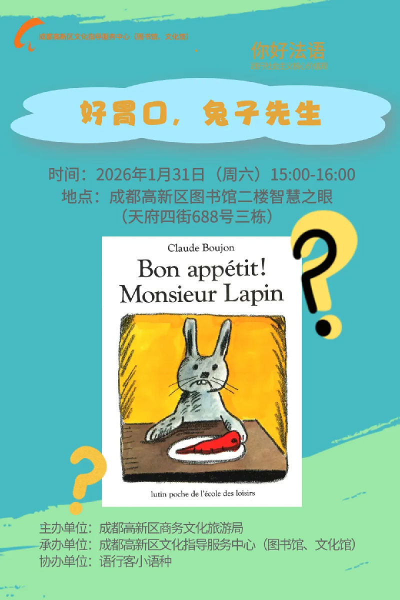 本期活动将围绕经典绘本《好胃口,兔子先生》展开一场别开生面的趣味互动之旅,由专业老师带领小读者们走进奇妙的动物世界,认识兔子先生的各位动物邻居,了解他们的饮食习惯并学习相关的法语词汇。欢迎小朋友们一起来玩转法语,开启一段有趣的语言之旅!