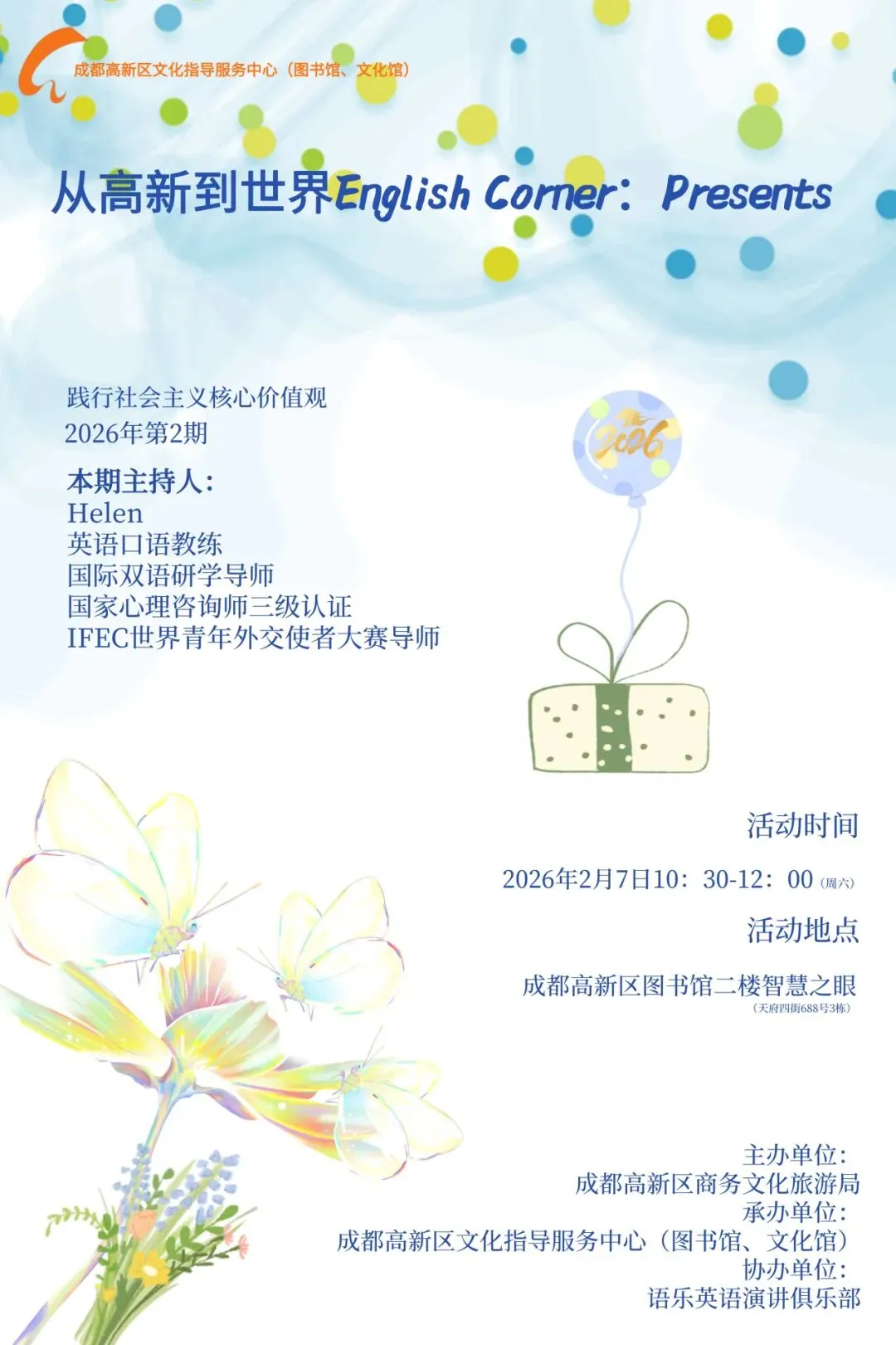 春节将至,有什么礼物曾点亮你的这一年?快来分享你心中最特别的那份“礼物”吧!——无论是收到的一份惊喜,还是经历的一段如礼物般美好的时光,都欢迎你带着故事,来参加我们的迎春英语角。在这里,我们将一起分享欢笑、结识新友,用温暖轻松的方式,庆祝生活中这些值得珍藏的瞬间。本周六,期待与你相见。