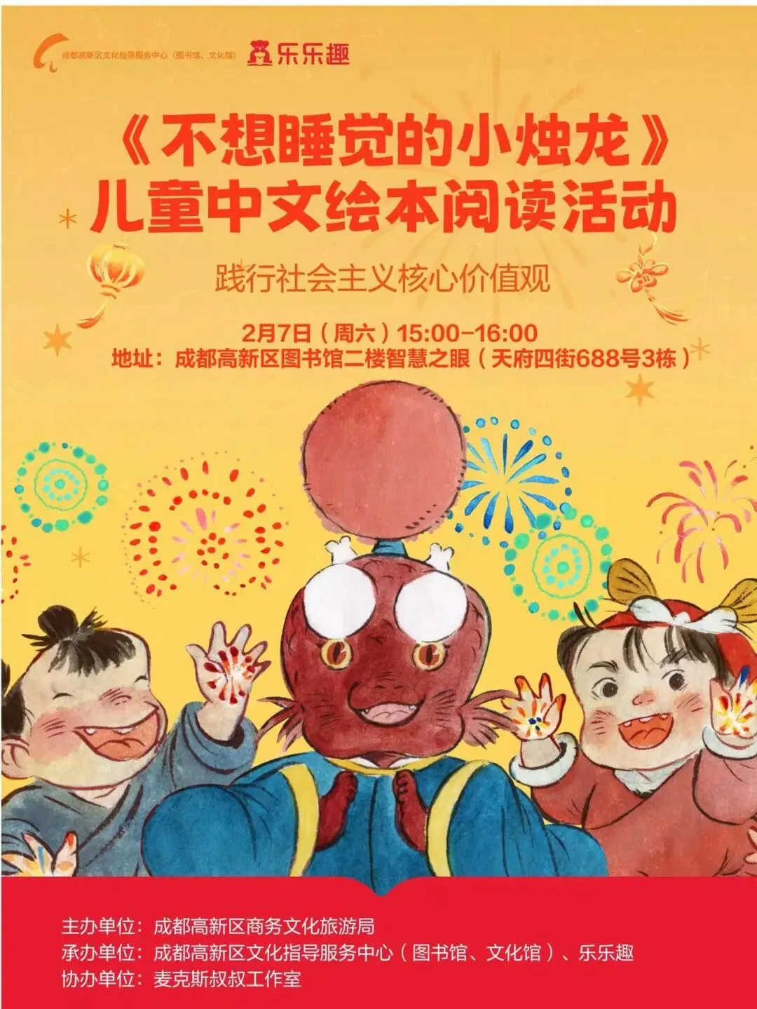 新春将至,诚邀孩子们一同走近传统文化,感受神话故事的魅力。本次活动将分享绘本《不想睡觉的小烛龙》,它以《山海经》神兽为灵感,讲述小烛龙因想看烟花而不肯入睡,村民用掌心为其创造了一场温暖绚烂的“烟花”,最终小烛龙安心入眠的温情故事。欢迎小朋友们前来参与,在阅读中体会互助、包容与承诺的美好。