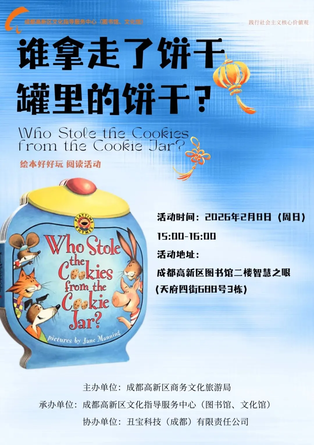 该活动以经典英文童谣绘本《谁拿走了饼干罐里的饼干?》为蓝本,通过侦探故事的形式,在互动中带领孩子们寻找“饼干失窃”的真相。本次活动不仅能帮助孩子们掌握基础英文句式和词汇,还能在轻松愉快的氛围中培养英语语感、表达自信和团队协作能力。欢迎小朋友们前来参与,在充满韵律的游戏和角色扮演中,一起体验英语学习的乐趣。